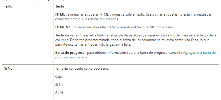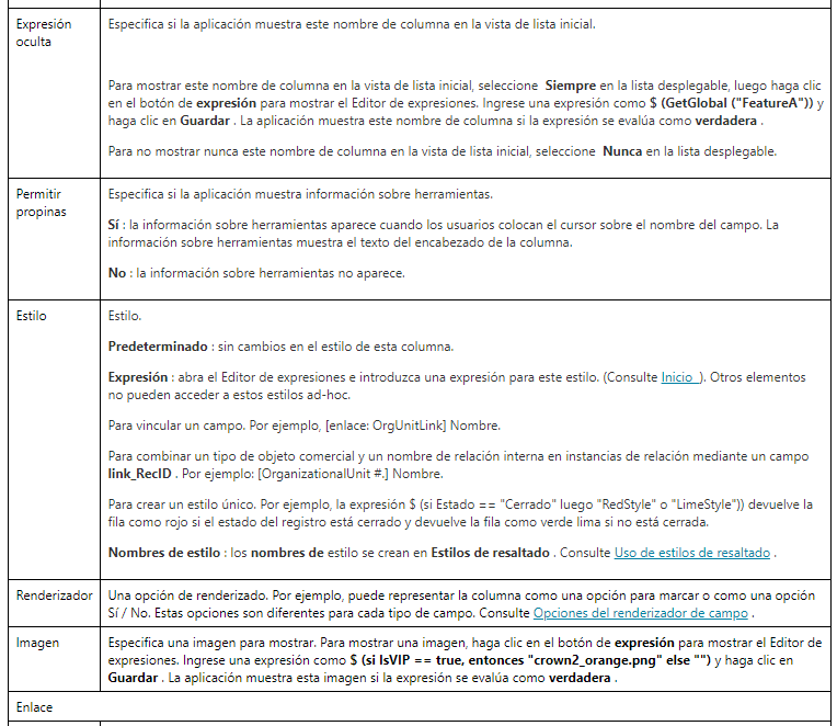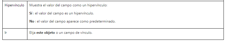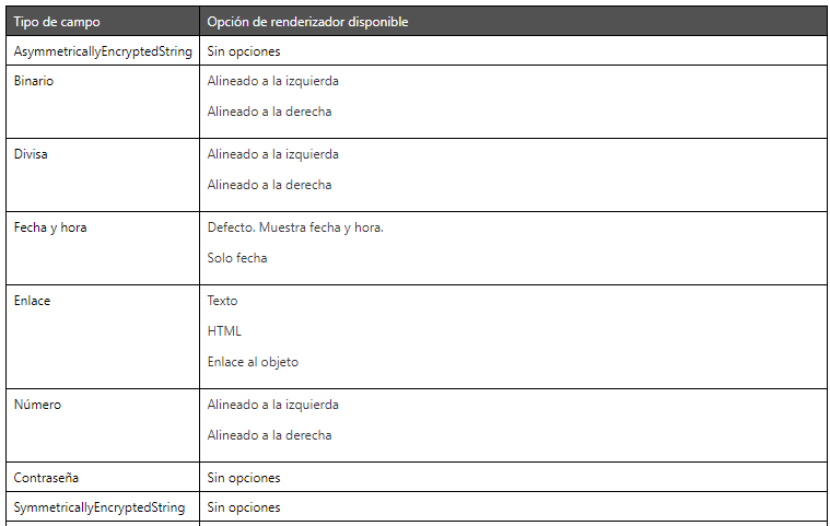 Las siguientes opciones de representación están disponibles para cada tipo de campo.