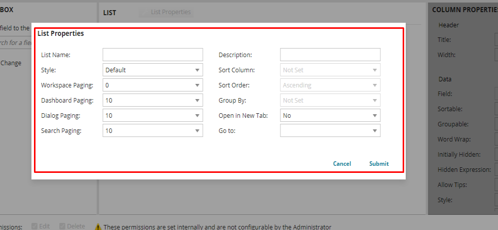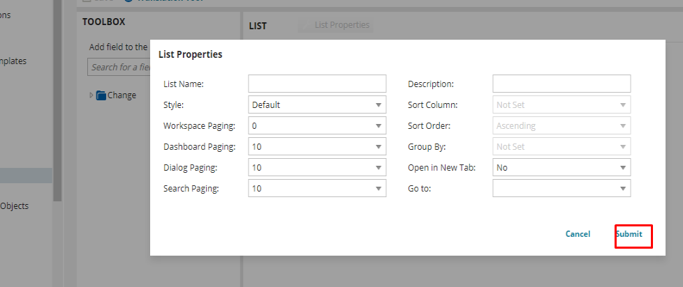 6.Haga clic en Enviar. La aplicación crea una lista vacía. Puede acceder a estos campos nuevamente haciendo clic en Propiedades de la lista.