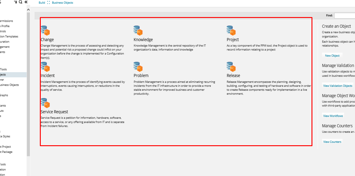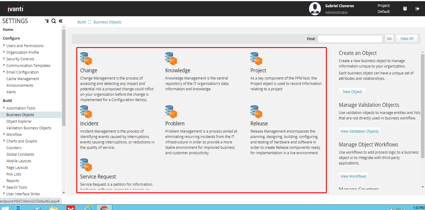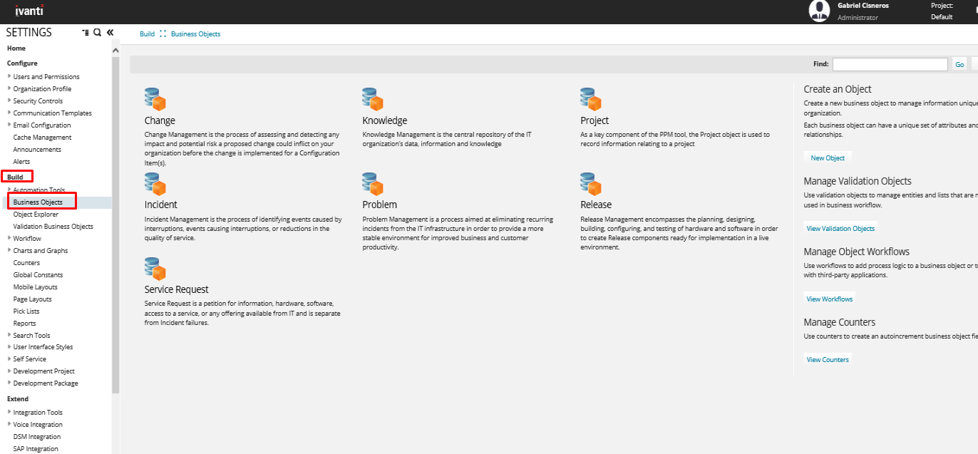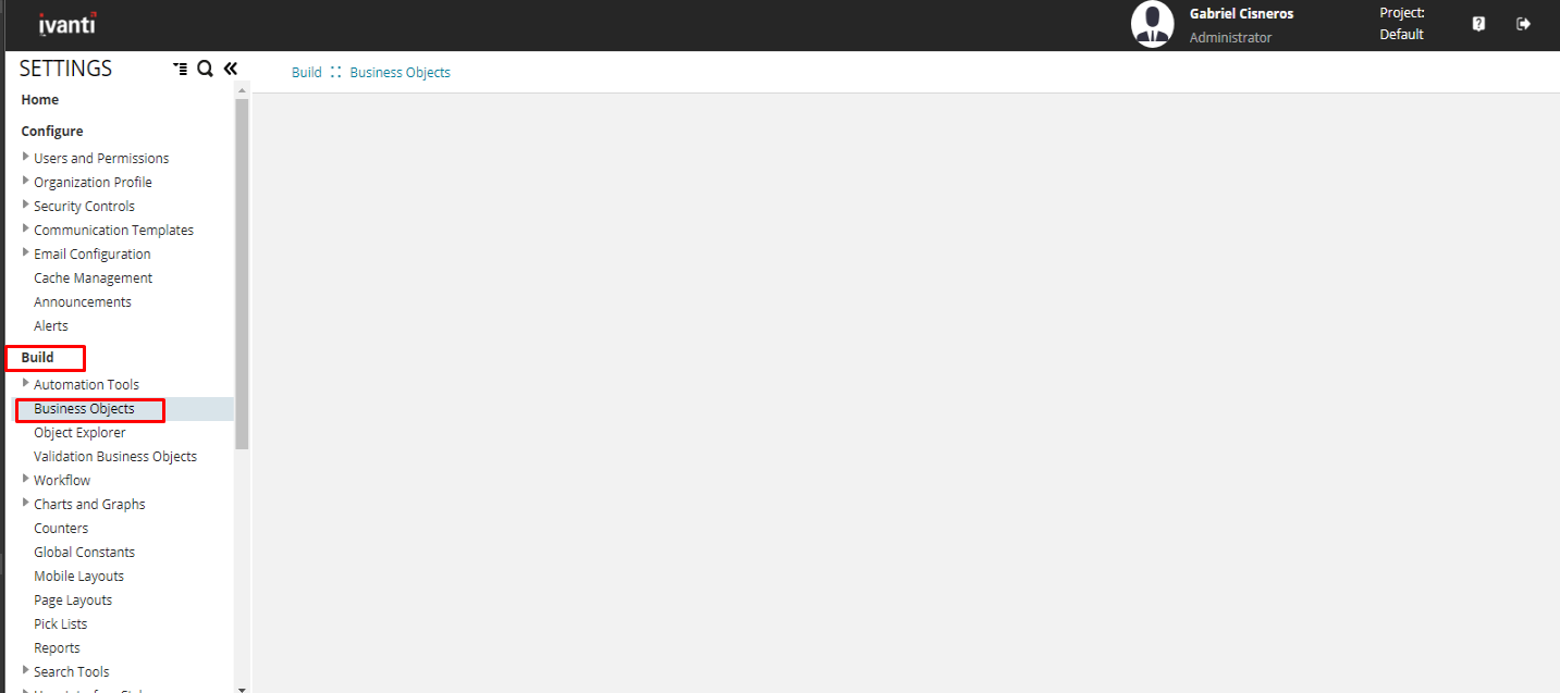 1.Desde la Consola de configuración, haga clic en Generar> Business Objects para abrir el espacio de trabajo de Business Objects.