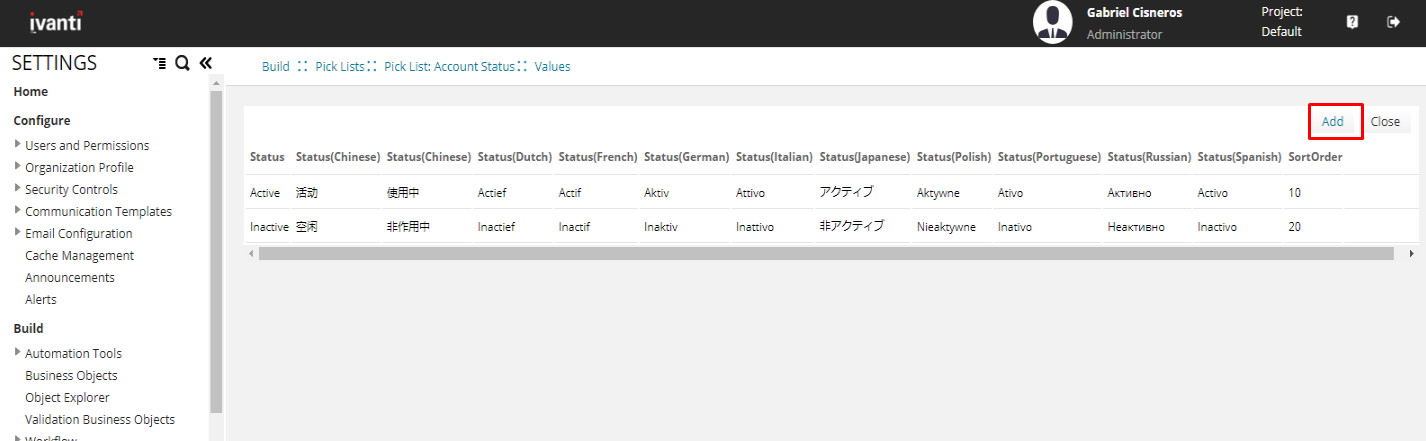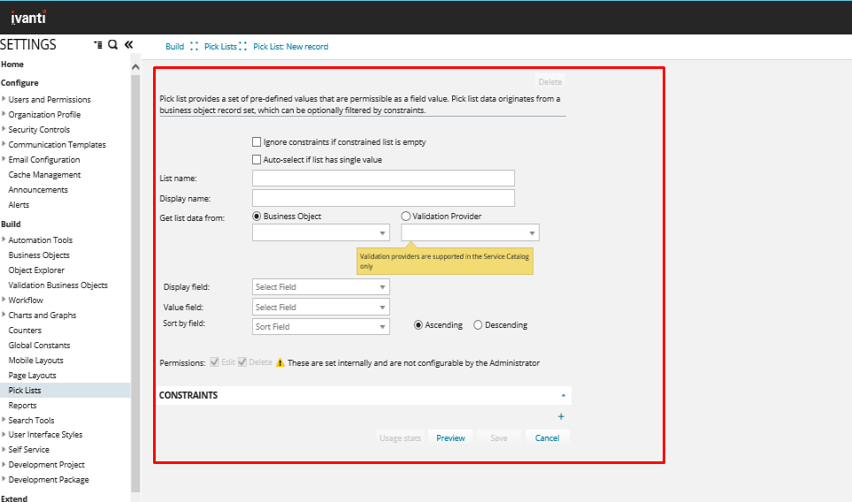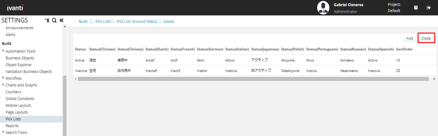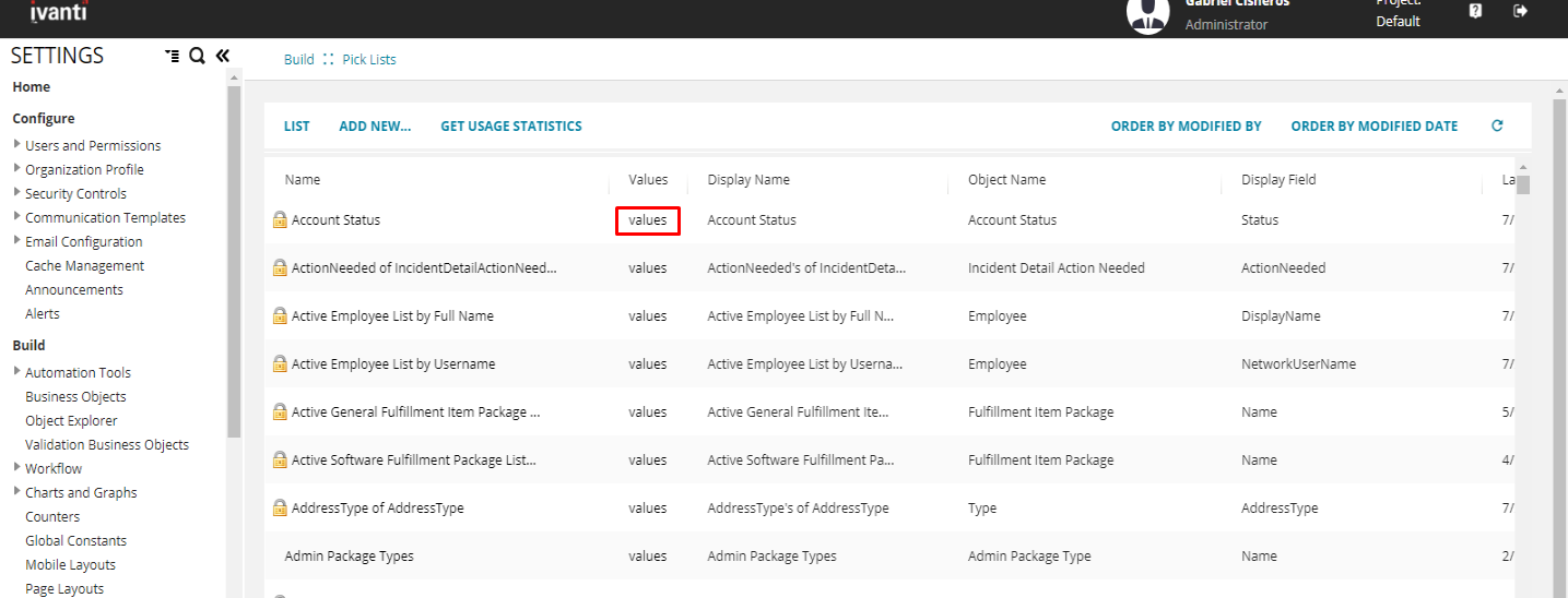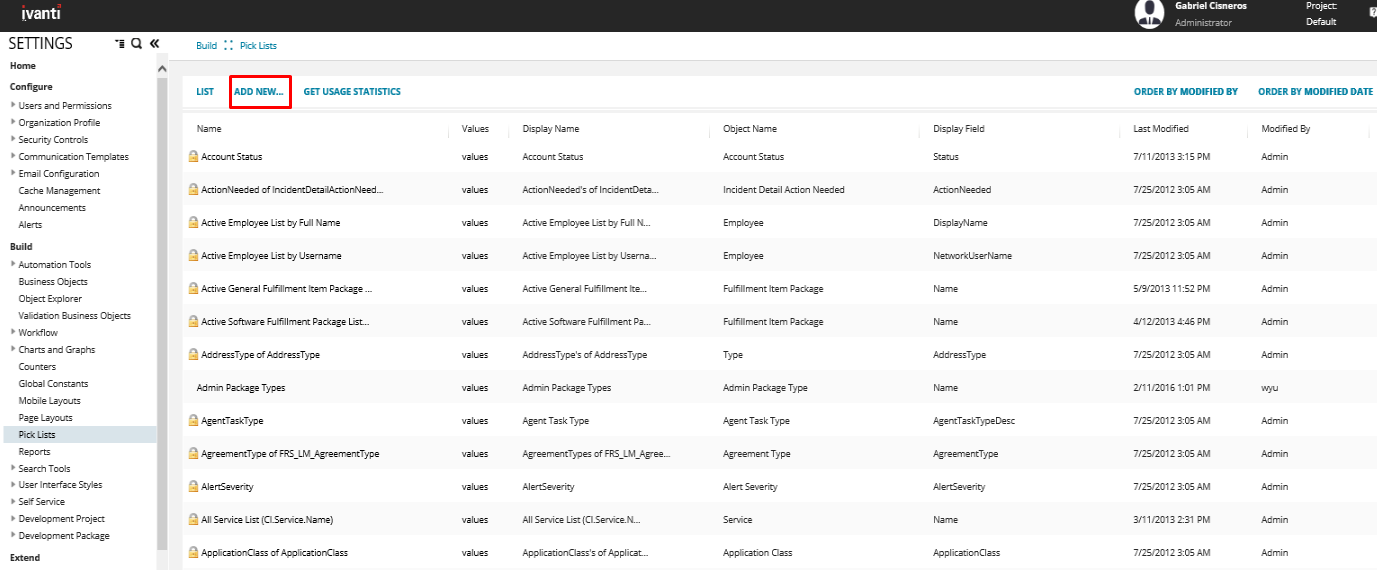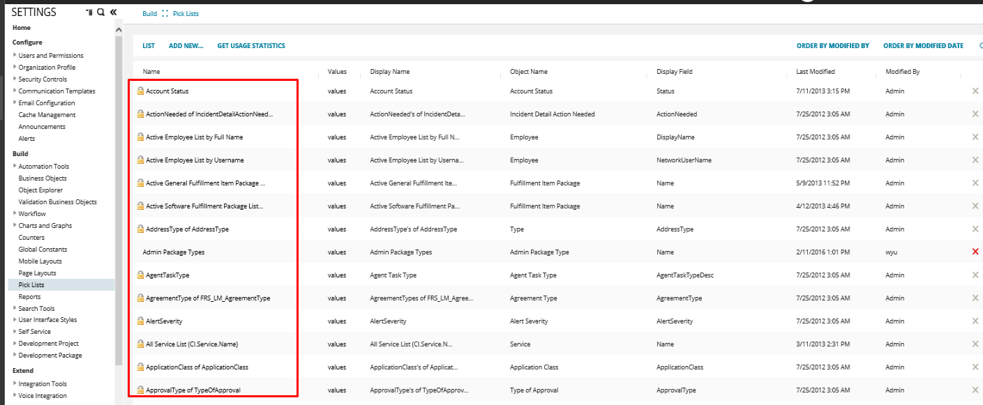 1.Desde la Consola de configuración, haga clic en Generar> Listas de selección para abrir el espacio de trabajo Listas de selección. La aplicación muestra una lista de listas de selección.