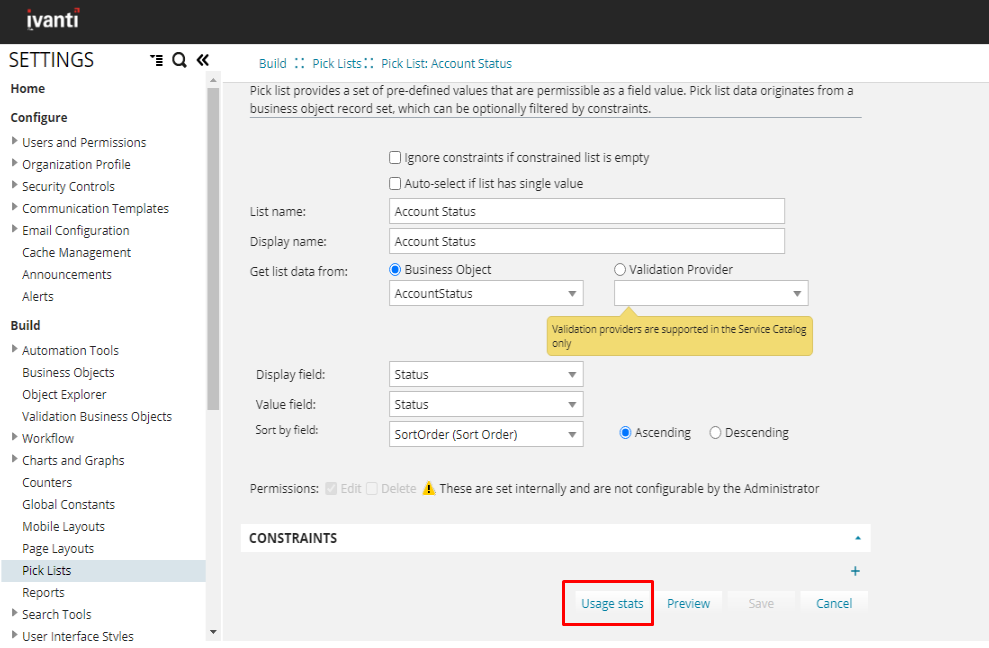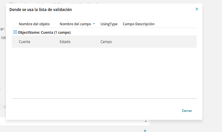 3.(Opcional) Haga clic en Estadísticas de uso para ver los objetos comerciales donde se usa la lista de selección y el nombre de su campo vinculado.