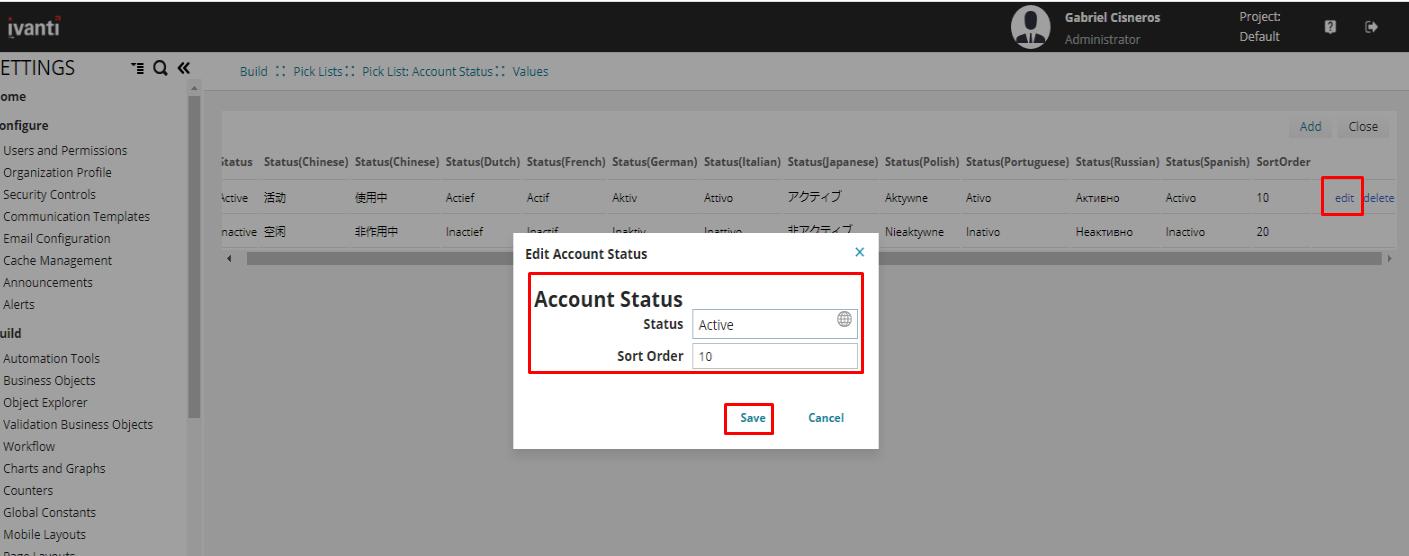 2.Haga clic en los valores junto a la lista de selección para modificarlos. Aparece la lista de valores.