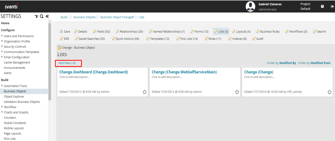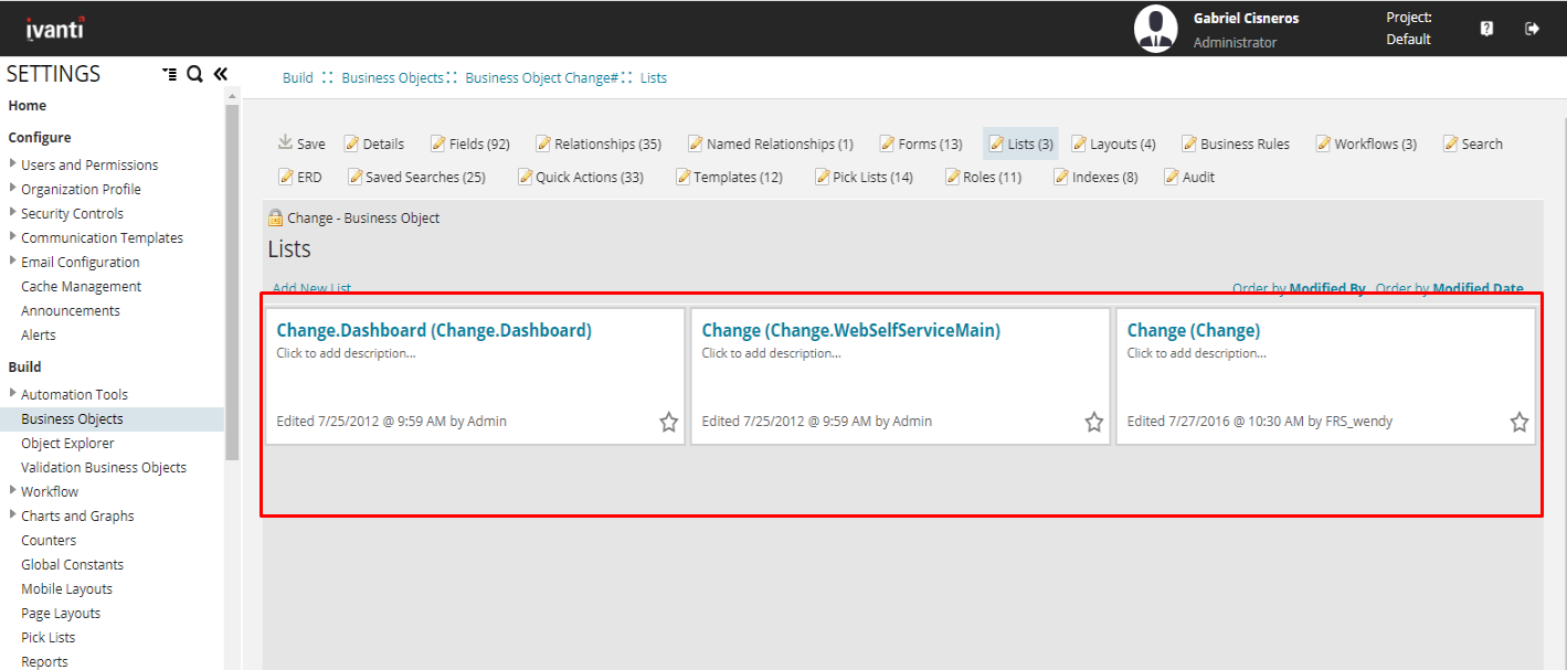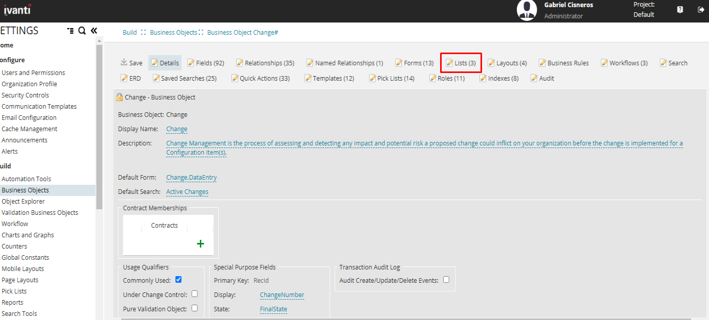 3.Haga clic en la pestaña Listas. La aplicación muestra un conjunto de listas creadas para el objeto comercial.