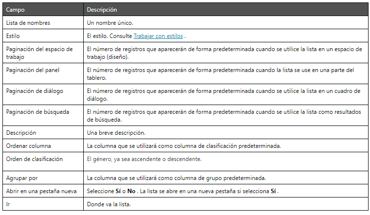 3.En la parte superior, haga clic en Listas de selección. La aplicación enumera todas las listas de selección asociadas con ese objeto comercial.
