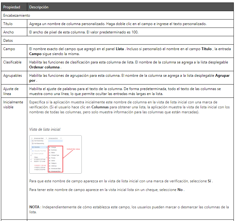 8.Defina las propiedades de cada columna de la lista según sea necesario. Las propiedades de la columna aparecen en el panel de la derecha.