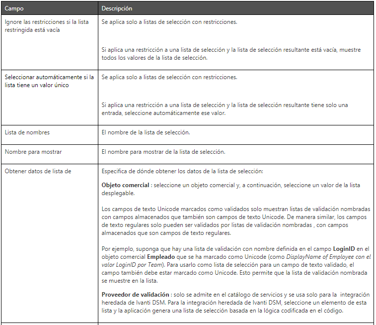 Una lista de selección es una lista de valores que se muestran en una lista desplegable o cuadro combinado. Las listas de selección proporcionan valores de campo a otros objetos comerciales y se almacenan como objetos comerciales secundarios en una relación.