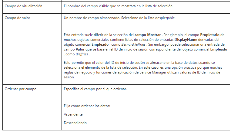 Cada valor de una lista de selección se obtiene de una fila de la tabla en un objeto comercial. Por ejemplo, la lista de selección Lista de empleados activos por nombre completo deriva sus valores de la fila de la tabla Nombre completo en el objeto comercial Empleado.