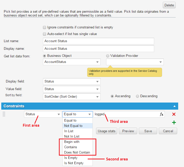 Como otro ejemplo, para agregar una restricción a la lista de selección Lista de empleados activos por nombre completo para incluir a todos los empleados activos, ingrese Estado en la primera área, ingrese no igual a en la segunda área e ingrese Terminado en la tercera área.